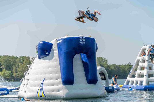 Add serious thrills with this large corner jump feature. Two novice up-down climbing routes utilize Tritex material for traction and cooling effects. Once on top users choose from three jumping platforms, two located at 8’ H (2.44 m) and one at a towering 10’ H (3.05 m). The main platform features a high-velocity chute slide option for a (slightly) milder descent than a full standing jump. The inside corner offers an exciting 8’ (2.44m) tall drop slide while avid climbers test their skills on two advanced lines ascending from the water on the outside corners. Ideally positioned as a corner on Ring or Serpentine parks, this item can also be used as a stand-alone. Connects on one or two sides using our Interlock connection system.